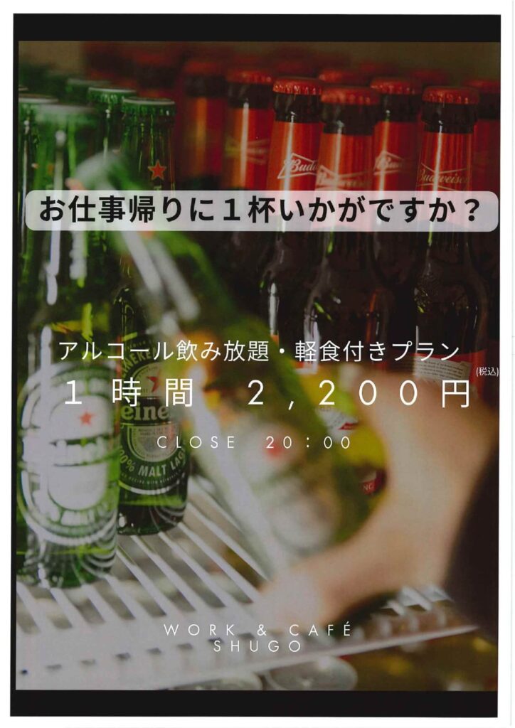 夜には、アルコール飲み放題+軽食付きの「1時間2,200円プラン」も登場。