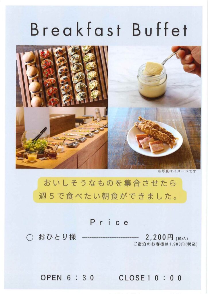 6:30〜10:00までは、ホテルクオリティの朝食が楽しめるブッフェレストランとして営業。